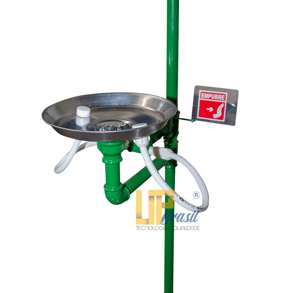 - Lava Olhos - Acionamento manual comandado por alavanca empurre e válvula esférica de ½ polegada. - Cuba em Aço Inox AISI 304 com regulagem de vazão nos lava-olhos através de uma válvula esférica de ½ polegada. - Crivo fabricado em ABS ou Aço Inox AISI 304 resistente a agressões químicas.