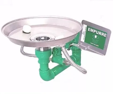 - Lava-olhos de parede com acionamento manual através de alavanca empurre em aço inox, bacia em aço inox, com diâmetro de 290 mm, válvula de esfera Ø 1/2?, regulador de vazão e pressão, tubos e conexões galvanizado com pintura epóxi. Esguichos em plástico ABS. A fixação é feita diretamente na parede, através de suporte, conexão de 1/2? BSP para entrada de água, e para saída de esgoto 1?BSP. Atende a norma ANSI / ISEA Z358.1 ? 2009. Vazão de 1,5 l/min, pressão recomendada pela norma ANSI 3 kgf/cm² ( 43,5 psi ).